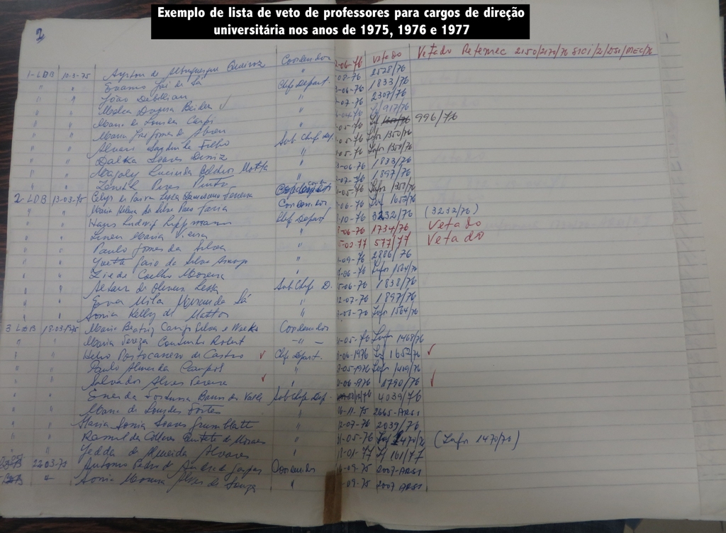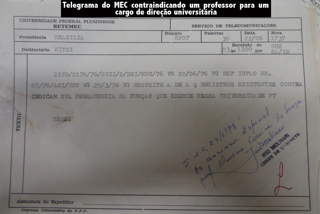 O presente artigo tem como finalidade descrever e analisar a perseguição e o controle de professores da Universidade Federal Fluminense (UFF) na época da ditadura empresarial militar (1964-1987). Para tal objetivo destacaremos os documentos que demonstram o controle na contratação de professores pelos órgãos da ditadura e o veto de docentes a cargos de direção universitária que seriam considerados críticos à ditadura pelos órgãos de segurança e informações do Serviço Nacional de Informações (SNI).